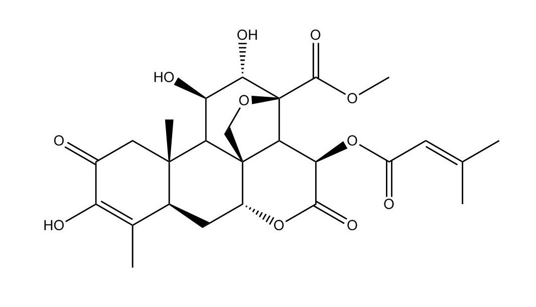【英文別稱】 13,20-Epoxy-3,11β,12α-trihydroxy-15β-[(3-methyl-1-oxo-2-butenyl)oxy]-2,16-dioxopicras-3-en-21-oic acid methyl ester